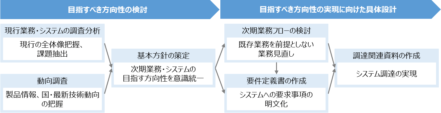 独自開発し長期利用してきた現行システムの利用終了に伴い、現状の問題・課題や昨今の行政デジタル化、技術動向などに対応した次期システム導入の基本方針を策定し、システム調達に関わる各種作業を実施することを狙いとし、本案件を通して、下記の問題・課題の解決を目指しました。