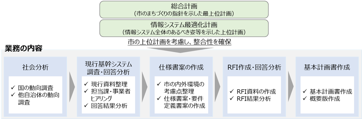 次期基幹システムに安全かつ確実に移行するとともに、市民サービスの向上や業務効率化に資するシステムを導入するため、現状や市場動向等を調査、分析し、その方向性を基本計画書として策定することを狙いとし、本案件を通して、下記の問題・課題の解決を目指しました。