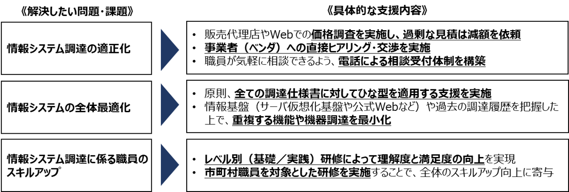 当該自治体では、ICT の進展や行政を取り巻く環境の変化に対応するため、調達支援のあり方が課題となっていました。このため、IT調達の価格や仕様の妥当性、システム納品時の検収、技術的助言などについて、専門的な知見を活用する必要が生じていました。また、組織全体のシステム最適化や、IT 調達に係る職員の対応力を高める観点から、継続的な支援体制の確立が求められていました。